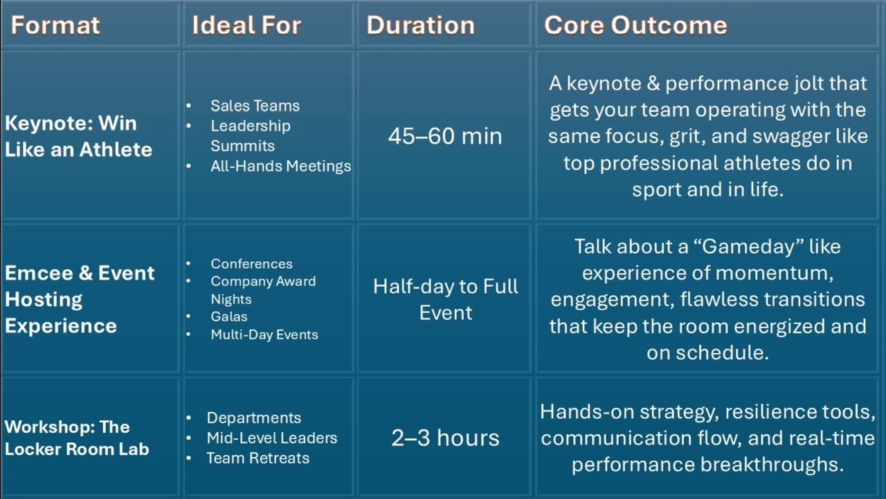 Picture this: you and your team hitting the field of life with the precision, drive, and focus of a pro football player. Now imagine leading with that same level of strategy and passion every single day not only in the office, but in your own personal arena!